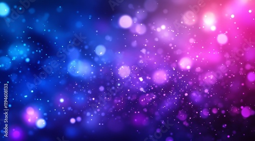 Abstract blue and pink bokeh background with glowing particles and sparkles.