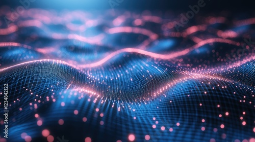 Abstract blue and pink wave pattern with tech-inspired mesh wireframe design for backgrounds