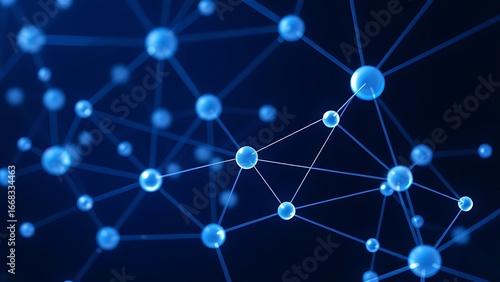 Abstract blue and white interconnected spheres with glowing nodes, symbolizing a digital network on a dark background.