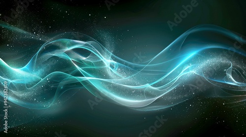 Abstract Blue and White Waves with Sparkles on a Dark Green Background