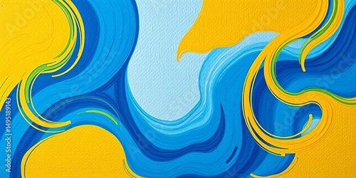 Abstract blue and yellow swirling shapes on a rough, textured canvas background, painting, color combination