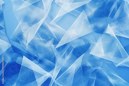 Abstract blue background design featuring layered textured white material in triangle diamond and square shapes. Geometric pattern creates a modern and artsy visual effect.