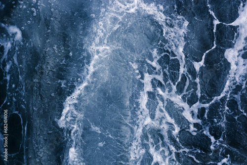 Abstract blue background white veins, ocean wave, bubble and foam at high tide, pattern