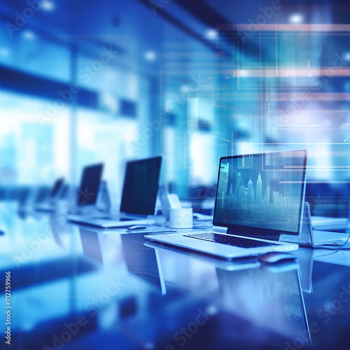 Abstract blue blurred background of modern office interior. Mock up, toned