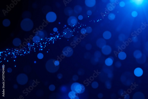 Abstract blue bokeh background features a stream of glowing particles and bright light rays, creating a dreamy, ethereal atmosphere with a magical feel.