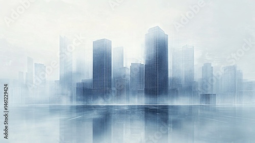 Abstract Blue Cityscape with Reflections and Foggy Atmosphere in a Minimalist Style