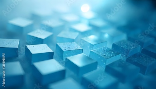 Abstract blue cubes with water droplets and soft lighting forming a pattern