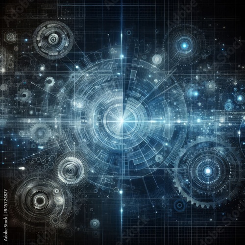 Abstract blue digital technology background with gears and cogs, dark color palette