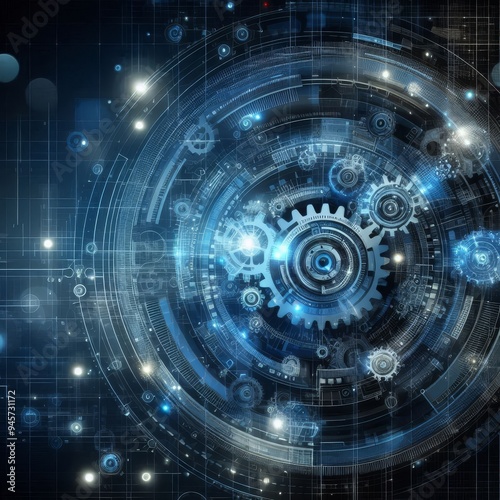Abstract blue digital technology background with gears and cogs, dark color palette