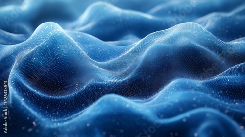 Abstract blue digital technology landscape with smooth wave-like shapes and sparkling light particles for future innovation