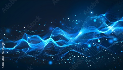 Abstract blue digital wave background with glowing dots and wavy lines on a dark black backdrop, in the style of a vector illustration, in the style of an AI generative text