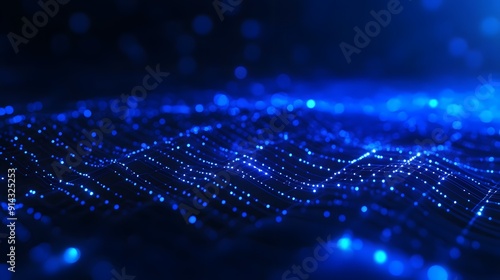 Abstract blue digital wave with glowing particles and dots on a dark background. Futuristic technology design for data visualization.