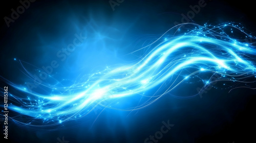 Abstract blue energy wave, glowing particles, dark background, technology concept
