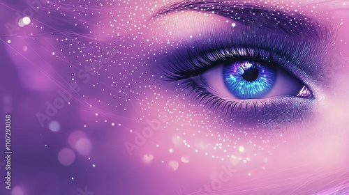 Abstract blue eyes. Tech circles of various sizes in lines and dots, pink glow on a purple gradient background.