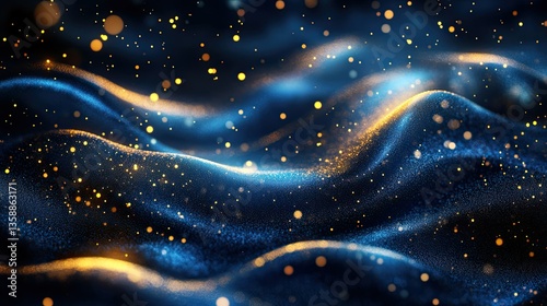 Abstract Blue Flowing Lines with Golden Glimmering Particles on Dark Background -