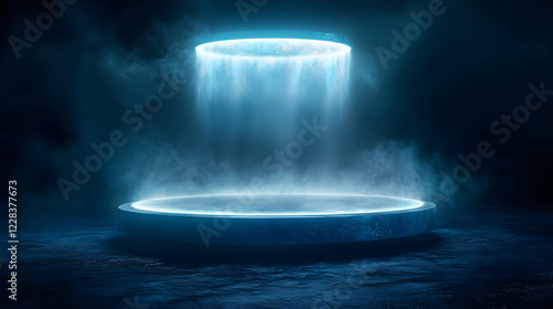 Abstract Blue Glowing Circle Platform in Dark Smoky Background