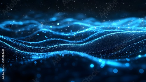 Abstract blue glowing light waves and data flow in a space background for technology,