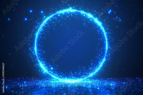 Abstract blue glowing particles rotating in a circle on a dark blue background, creating a magical and futuristic atmosphere