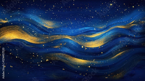 Abstract blue gold waves, cosmic night sky, glittering stardust; website design