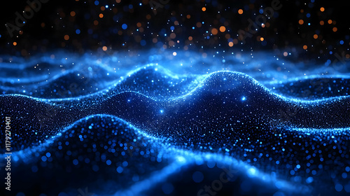 Abstract Blue Particle Waves Flowing Smoothly with Glowing Light Particles Background