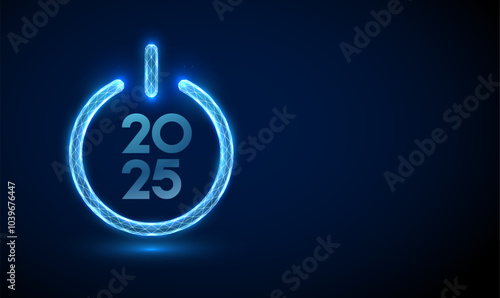 Abstract blue power button with number 2025 inside. Happy New Year greeting card. Low poly style design.