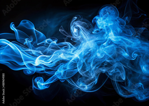 Abstract blue smoke steam dynamically swirls and curls on a dark black background, illuminated by a solitary, isolated light source, creating an otherworldly atmosphere.