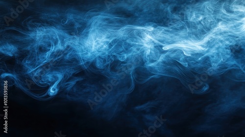 Abstract blue smoke swirls against a dark background, creating a mysterious atmosphere.