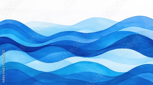 Abstract blue watercolor waves, ocean texture, white background, calming design