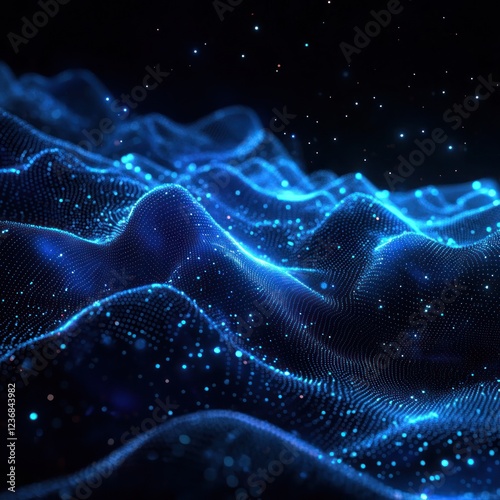 Abstract blue wave pattern with glowing specks on a dark background; for digital use