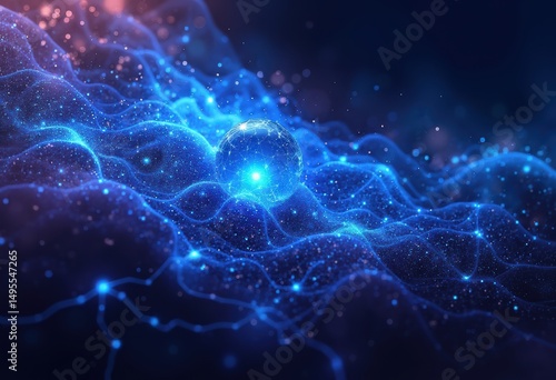 Abstract blue wave pattern with glowing sphere in a cosmic background