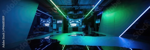 Abstract blue-green gradient studio room with reflective walls and floor illuminated by neon lights, creating a dynamic background