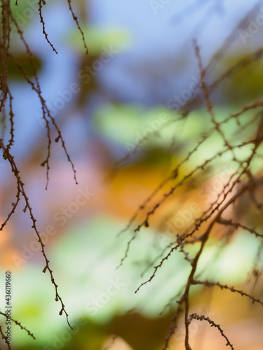Abstract blurred background. Branches and a pond with water lily leaves. Copyspace.