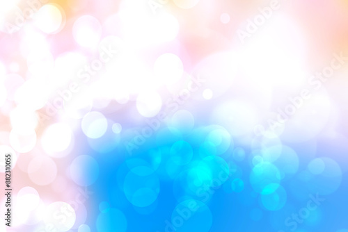 Abstract blurred fresh vivid spring summer light delicate blue yellow white bokeh background texture with bright circular soft color lights. Beautiful backdrop illustration. Space.