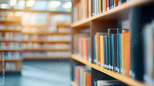 Abstract blurred public library interior space. blurry room with bookshelves by defocused effect.