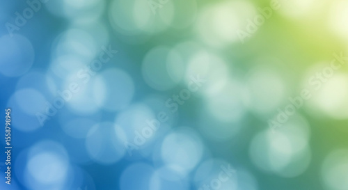 Abstract bokeh background with blue, green, and yellow blurred lights in a soft gradient