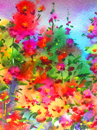 Abstract bright colored decorative background . Floral pattern handmade . Beautiful tender romantic garden with wild flowers , made in the technique of watercolors from nature.