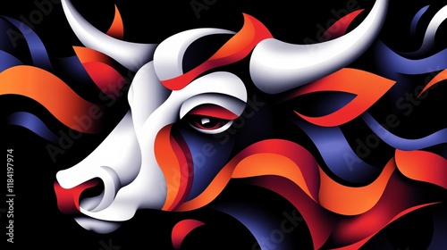 Abstract bull head illustration. Bold colors and layered design create a striking visual.