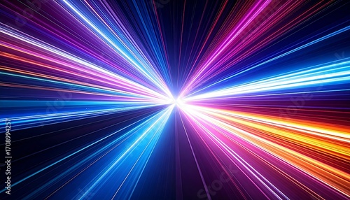 Abstract burst of vibrant light rays emanating from a central point, showcasing dynamic motion in blue, pink, and orange