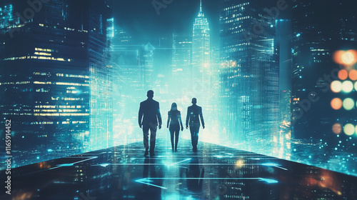 Abstract business team stands on the peak of success amid tall, innovative Smart city and graphs with statistics to analyze business potential and predict future developments in company growth.