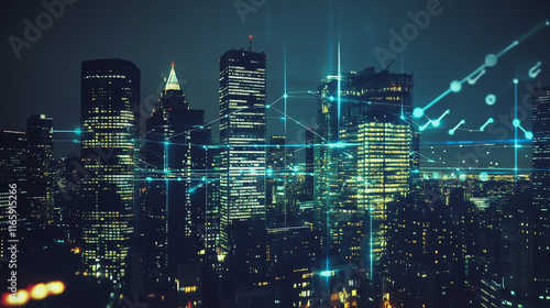 Abstract business team stands on the peak of success amid tall, innovative Smart city and graphs with statistics to analyze business potential and predict future developments in company growth.