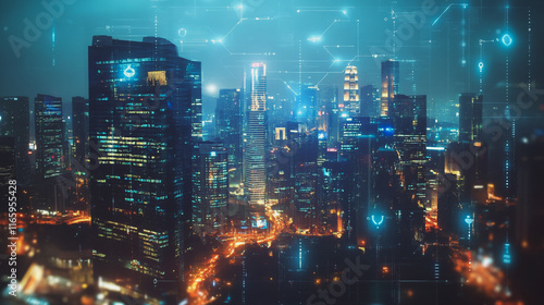 Abstract business team stands on the peak of success amid tall, innovative Smart city and graphs with statistics to analyze business potential and predict future developments in company growth.