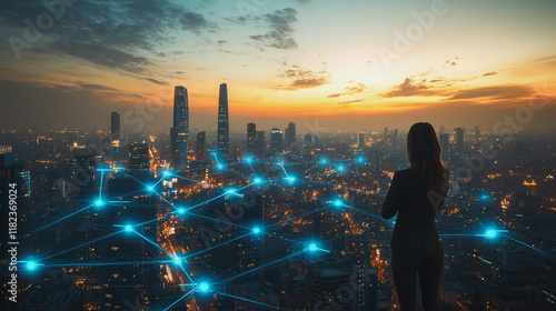 Abstract business woman stands on the peak of success amid tall, innovative Smart city and graphs with statistics to analyze business potential and predict future developments in company growth.
