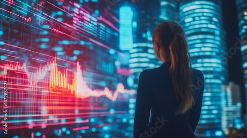 Abstract business women stands on the peak of success amid tall, innovative Smart city and graphs with statistics to analyze business potential and predict future developments in company growth.