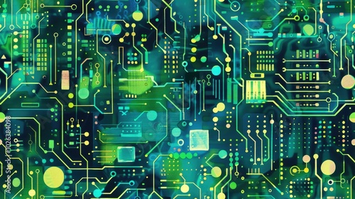 Abstract circuit board design in blue and green tones