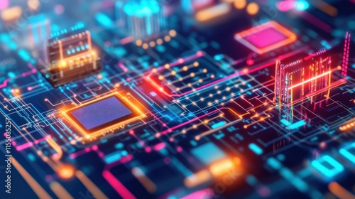 Abstract Circuit Board: Neon Glow, Digital Technology, Microchip, Processor, Innovation, Electronic Components,