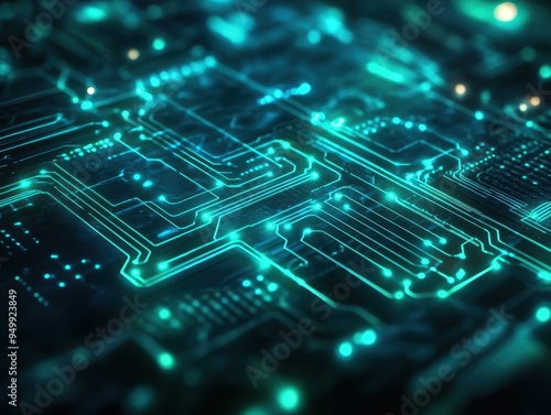 Abstract Circuit Board with Glowing Green Lines and Bokeh Lights - Technology Background