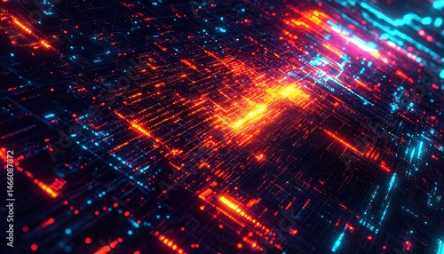 Abstract Circuit Board with Red and Blue Diodes on Dark Technological Background