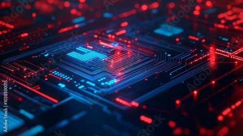 Abstract circuit board with red and blue glowing lights, dark background