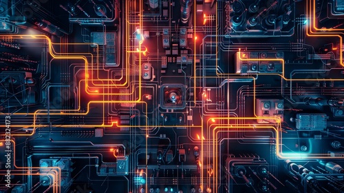 Abstract Circuitry - Neon Lights and Wires - A mesmerizing abstract illustration of complex circuitry, illuminated by vibrant neon orange and blue lights, showcasing the intricate connections and path
