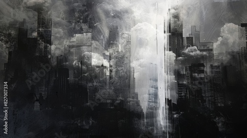 Abstract city, black building in the center of the composition has a radiance of light